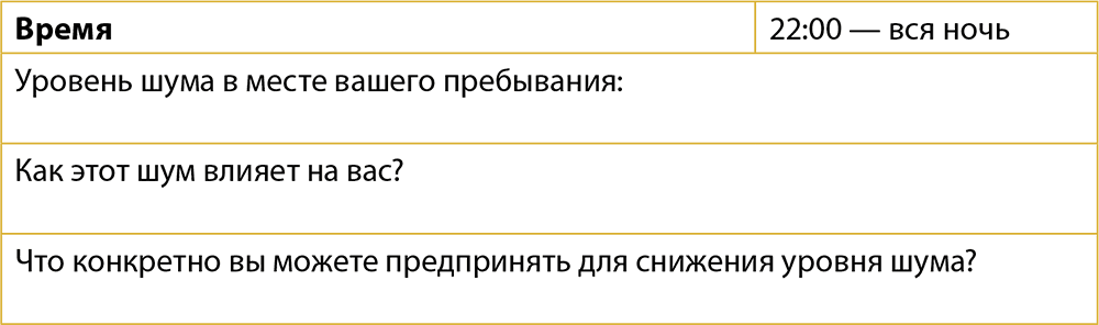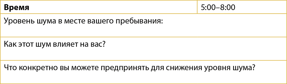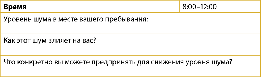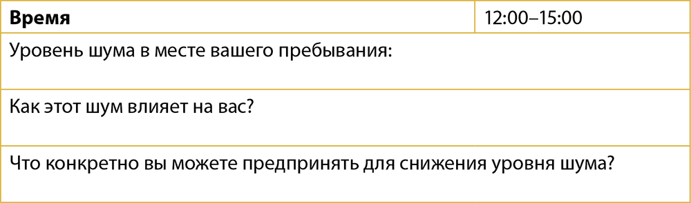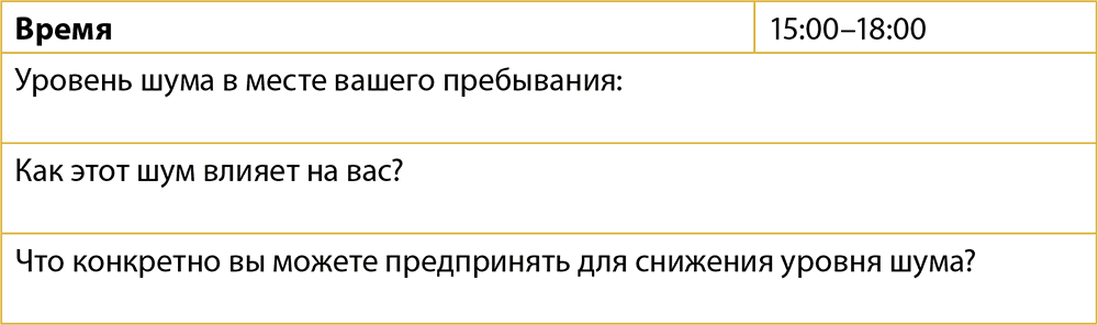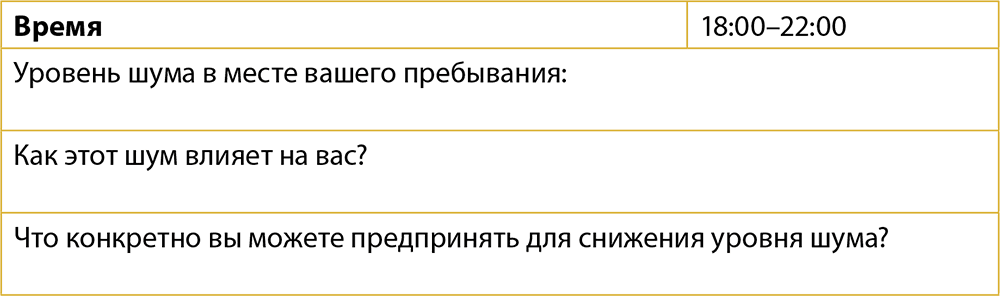 Используйте нижеприведенные таблицы, чтобы определить, когда уровень окружающего вас шума наибольший. Если он слишком высок, подумайте о мерах, которые вы могли бы предпринять для его снижения.