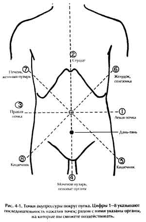 b. С помощью большого пальца или локтя нажимайте на указанные точки в той последовательности, в какой они приведены на рис. 4-1 (рис. 4-3, 4-4). Например, после того, как вы воздействовали на Ворота Паха и Ворота Моря Ветров (Данъ-тянь), переходите к точке 1, при этом помните, что в понедельник следует нажимать на эту точку, пока вы не насчитаете восемь ударов пульса. Если это происходит во вторник, вы должны выждать семнадцать ударов пульса, в среду - девятнадцать, в четверг - двадцать один, и т. д. до конца недели.