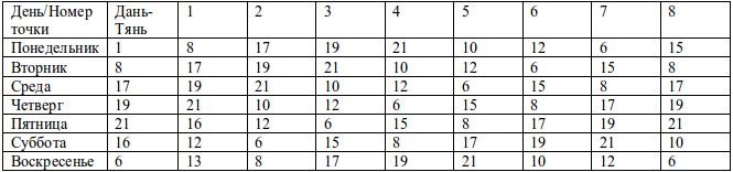 c. Нажмите на точки 1-8 Пупочного Центра, выдерживая нажатие в течение стольких ударов пульса, сколько указано в таблице.