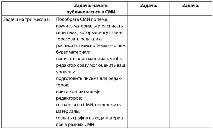 Например: вы берете пункт «начать писать в СМИ». Его можно разбить на такие задачи: