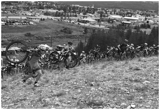 Если у меня и были какие-то иллюзии по поводу того, что мне легко дастся первая велогонка серии Leadman, трасса Silver Rush 50 отмела их напрочь. Первые 90 метров трасса поднимается вертикально вверх по голому каменистому склону. Ни дороги, ни тропы. Ехать невозможно, и гонщики катят велосипеды или тащат их на себе. Но самый убойный момент в том, что в верхней части холма пространство резко сужается до одноколейки, и, чтобы оказаться на хорошей позиции, нужно бежать вверх изо всех сил. А организаторы еще и заманивают лидеров: первому мужчине или первой женщине, достигшим вершины холма, вручается серебряная монета.
