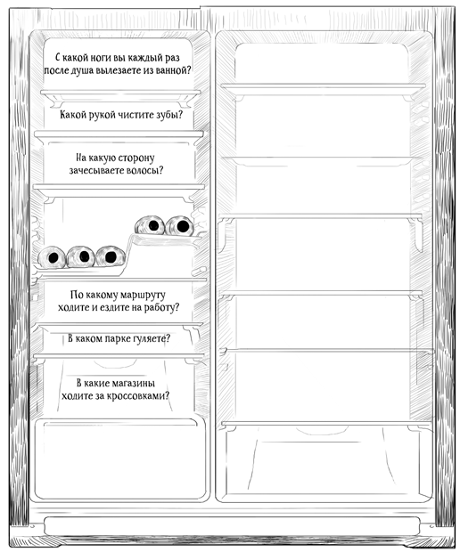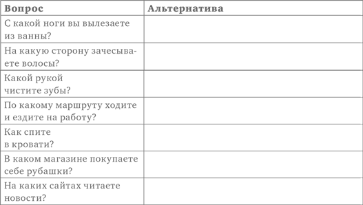 А теперь к каждому вопросу подберите, придумайте альтернативный вариант поведения. Например, если вы чистите зубы правой рукой, начните чистить их левой рукой. Зачесываете волосы направо? Зачешите в очередной раз их налево, назад, вперед или не расчесывайте вовсе.