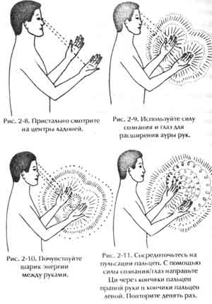 b. Сфокусируйтесь на середине ладоней, пристально глядя на их центральные точки уголками глаз. Эти части глаз содержат специальные клетки, способные воспринимать очень тусклый свет. Фокусируя глаза таким образом, вы сможете развить в себе способность видеть ауру и движения в темноте. Используя силу сознания и глаз, вы можете заставить ауру каждой ладони усиливаться и расширяться (рис. 2-9). Ци может ощущаться как сжатие и втягивание, вы почувствуете, как сила входит в ваши ладони или как ваши ладони расширяются. Углами глаз вы можете увидеть между ладонями шарик Ци или цветной шарик (рис. 2-10).
