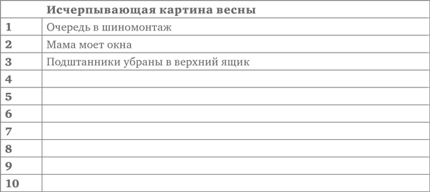 Теперь и вы по стопам мастера дайте не менее десяти вариантов исчерпывающей картины весны, не используя при этом капе`ль, ручейки, кричащих котов, проснувшегося медведя, теплое солнце, лужи и грязь, девушек в мини-юбках, подснежники и иные стандартные, клишированные элементы для описания этого времени года. Стихотворная форма не обязательна, достаточно словосочетания. Чтобы процесс пошел легко, я дам три собственных варианта для раскачки. Дальше уже вы: