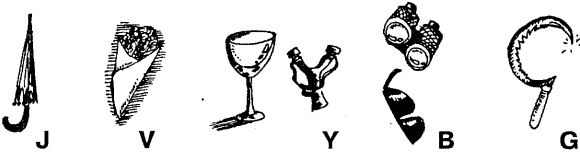Достоинство этого метода в том, что его удобно использовать и для запоминания правописания иностранных слов. Но, естественно, если вы захотите применять его для этой цели, вам будет необходимо придумать ассоциации и к латинским буквам, отличающимся от наших по форме. Например, "J" похожа на зонтик, "V" — на кулек с конфетами, "Y" — на фужер или рогатку, "В" — на очки или бинокль, "G" — на серп и т.д.