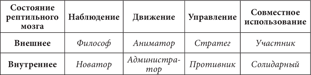 Личность (рептильная). Поведенческие шаблоны, согласно нейрокогнитивному и поведенческому подходу, основаны на четырех состояниях рептильного мозга, которые звучат так: наблюдение, движение, управление и совместное использование. Каждое состояние имеет две реализации – направленные внутрь или вовне.