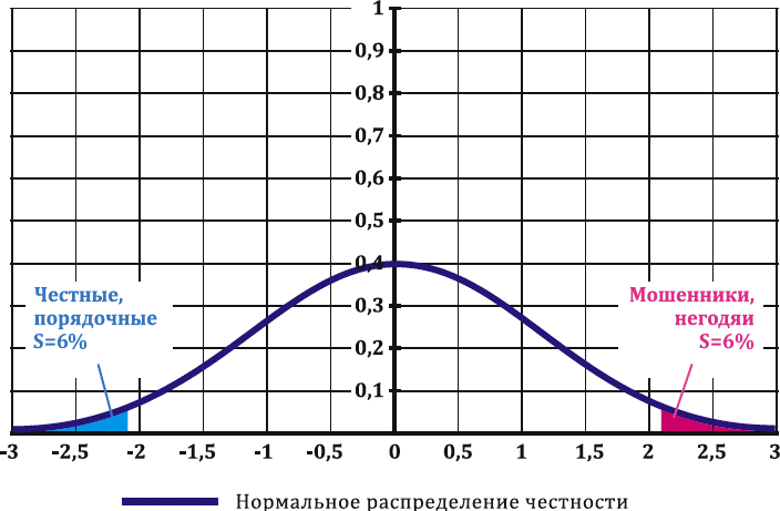 Если вспомнить кривую Гаусса, о которой говорилось выше, то можно увидеть, что распределение честных и порядочных людей в обществе подчиняется закону нормального распределения точно так же, как и большинство совокупных погрешностей (ошибок) в природе. Из чего логически следует, что кристально честных людей весьма мало. Подавляющее большинство склонно к обману в той или иной степени, определяемой «bell curve».