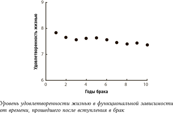 В качестве наглядной иллюстрации такого напряжения давайте рассмотрим информацию, которая могла бы быть полезной для Дарвина, – данные об уровне удовлетворенности людей браком в течение первых 10 лет из недавнего исследования, проведенного в Германии. Каждая точка в графике взята из самого исследования. Наша задача – вывести формулу для линии, которая соединит эти пункты между собой, и продлить ее в будущее, что позволит нам спрогнозировать события после десятилетней отметки.