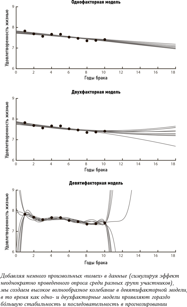 Первая потенциальная формула для предсказания уровня удовлетворенности жизнью будет опираться на один фактор – время, прошедшее с момента свадьбы. Таким образом, мы получим прямолинейный график. В другом варианте можно использовать два фактора – время и квадратное время; в результате у нас будет парабола, которая отразит потенциально более сложные отношения между временем и счастьем. А если мы включим в формулу еще больше факторов (кубическое время и т. д.), появится еще больше точек перегиба кривой, линия станет еще более изгибистой. Имея формулу, учитывающую девять факторов, мы сможем отразить поистине сложные взаимоотношения.