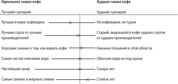 Подобная схема иллюстрирует, что я должен сделать, чтобы приблизиться к «идеальной» чашке кофе. Мне нужно приобрести кофеварку мирового класса, лучшие сорта кофе, чистейший сахар, свежайшие сливки, использовать ключевую воду и либо изучить вопрос варки кофе самому, либо пригласить специалиста, чтобы он меня научил. Я могу попробовать передвинуть один или несколько крестиков по направлению к «идеалу» или же оставить все как есть.
