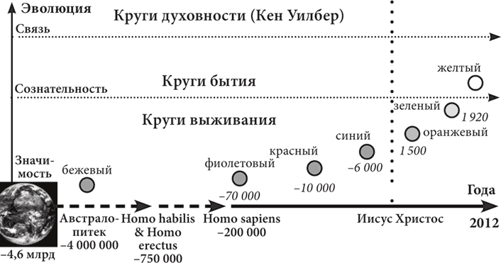 3.??? Знаки вопроса здесь потому, что хотя мы и можем предположить, какой могла бы быть наша эволюция, сейчас, через призму современного сознания, нам сложно постигнуть ее рамки. Согласно Кену Уилберу, третий круг будет эпохой связи.
