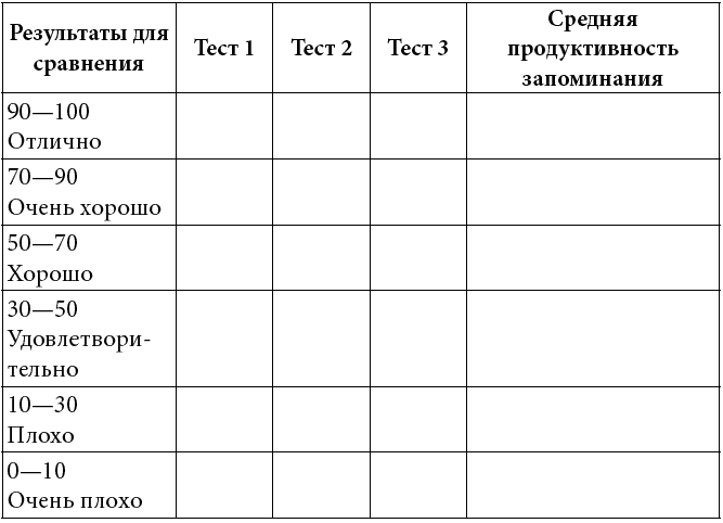 С помощью простой формулы вы можете определить рост продуктивности своей памяти, сопоставив результаты заключительного и вводного тестов. Для этого надо вычесть результат вводного теста (А) из результата заключительного теста (Б); разность составит прирост продуктивности запоминания (В). Затем разделите прирост продуктивности запоминания (В) на результат вводного теста (А) и полученное частное умножьте на 100. Таким образом вы определите относительный рост продуктивности запоминания в процентах.