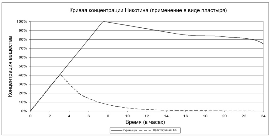 Хотя эта кривая концентрации является типичной, для бросающих курить, она не является типичной для практикующих ОС. Из-за быстро нарастающей десенсибилизации при использовании Никотина, имеет смысл наклеивать его только на время практики ОС и немедленно удалять после ее окончания. Например если пластырь наклеивается в 4 утра, его необходимо удалить в 7 утра, сразу после окончания практики. Такой подход является абсолютно обязательным, если вы хотите добиться хороших результатов. В следующей таблице сравниваются кривые концентрации Никотина в плазме у бросающих курить и у практикующих ОС: