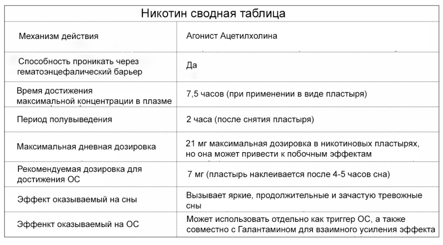Влияние на сны: Никотин оказывает глубокое воздействие на сны. Обычные (не ОС) никотиновые сны более тревожные, по сравнения с GPC/Галантаминовыми снами. Яркость никотиновых снов обычно низкая.