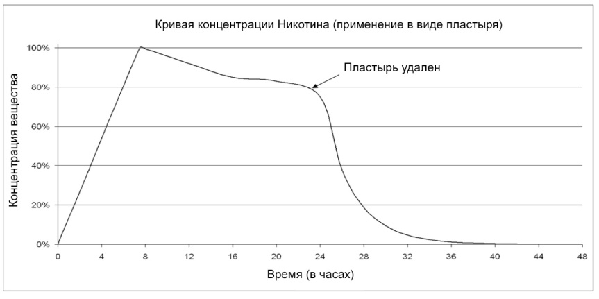 Кривая концентрации: если Никотин применяется в виде пластыря, кривая концентрации отличается от того случая, когда он принимается перорально. После того, как пластырь наклеивается, количество никотина в крови возрастает линейно до момента достижения максимальной концентрации. После этого концентрация медленно спадает в течении дня (пока пластырь сохраняет эффективность), а затем после его удаления быстро снижается.