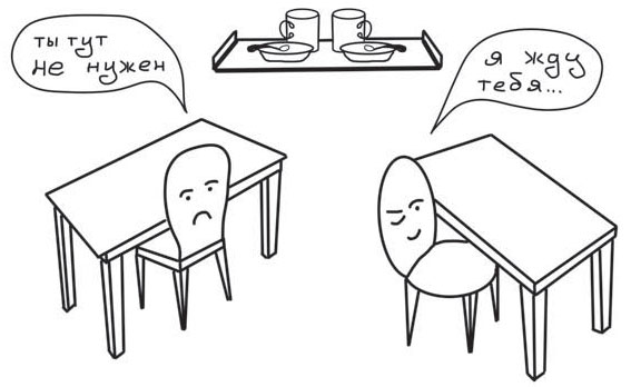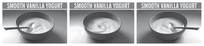 Если вы думаете, что это, должно быть, какой-то псих, раз на его желание делать уроки влияет всего лишь положение стула, ознакомьтесь с результатами исследования Элдера и Кришны{26}: рекламная картинка с йогуртом, где ложка ориентирована на рабочую руку (правую для правшей, левую для левшей), существенно повышает желание купить этот йогурт по сравнению с контрольной группой (ложка ориентирована на нерабочую руку). Аналогичным образом обстоят дела и с кофейной кружкой, если ее ручка повернута в сторону рабочей руки (см. картинки из этой статьи ниже).
