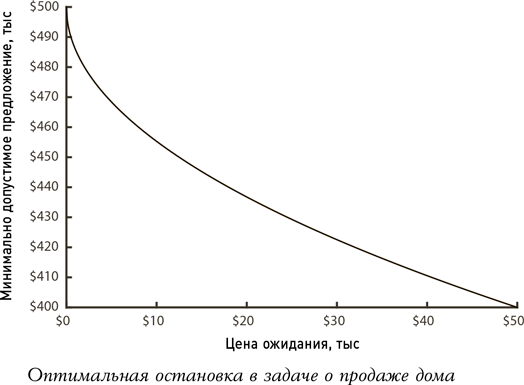 Этот математический расчет не будет волновать нас, если мы продаем многомиллионный особняк или полуразвалившийся сарай. В этом случае будет иметь значение только небольшая разница между самой низкой и самой высокой ценой, которую нам, вероятно, предложат. Если мы введем конкретные цифры, то увидим, что данный алгоритм предлагает нам множество четких указаний. Допустим, ценовой диапазон ожидаемых нами предложений варьируется от $400 000 до $500 000. Если цена ожидания незначительна, мы можем быть почти бесконечно разборчивы. Если цена ожидания следующего предложения составляет всего $1, то мы получим максимальную выгоду, всего лишь дождавшись покупателя, который предложит нам за дом $499 572,99 и ни центом меньше. Если ожидание обойдется нам в $2000 за предложение, придется дотянуть до $480 000. В условиях медленного роста рынка, где ожидание будет стоить $10 000, нам придется принять любое предложение, которое превысит $455 279. Ну и наконец, если цена ожидания составит половину или даже больше от ожидаемого нами диапазона предложений (в данном примере это $50 000), то нет абсолютно никакого смысла тянуть дальше и нужно приложить максимум усилий, чтобы продать дом первому, кто назовет свою цену, и покончить с этим. Нищим выбирать не приходится.