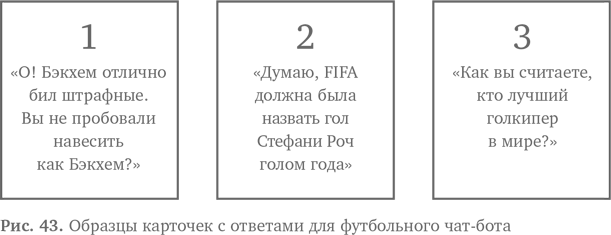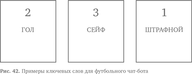 На карточках из первой группы напишите ключевые слова, которые виртуальный собеседник будет искать в разговоре. Это наш вводимый текст. Пронумеруйте карточки. Теперь расположите их в алфавитном порядке и соедините скрепкой. Например, первые карточки на футбольную тему могут быть такими, как на рис. 42, хотя вам, конечно, понадобится значительно больше ключевых слов.