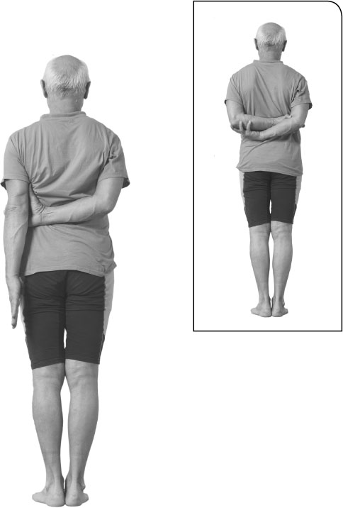 Стоя в Тадасане, отведите плечи назад и согните руки в локтях. Захватите сначала правой кистью левое плечо чуть выше локтя, потом левой кистью – правое плечо. Если вам сложно дотянуться до плеча, достаньте хотя бы до предплечья. Продолжайте отводить плечи назад, втягивать и опускать лопатки. Не напрягайте шею. Дышите спокойно. Останьтесь в позе 20–30 секунд. С выдохом аккуратно вытяните руки вдоль тела и повторите позу, меняя захват рук. Сначала захватите левой кистью правое плечо, потом правой кистью – левое.