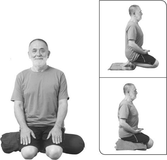 Встаньте на колени. Соедините колени, голени и стопы, прижимая их к полу по передней поверхности. Возьмите одеяло и, опустив голову на пол перед коленями, поместите одеяло в сгиб коленей. Аккуратно сядьте. Вытяните позвоночник вверх, поднимите грудную клетку и раскройте ее в стороны от центра. Опустите плечи. Отведите внешнюю поверхность плеч и локтей назад, опустите ладони на бедра, разверните ладони к потолку. Расслабьте верхнюю часть спины, опуская мышцы трапеций и лопатки вниз. Не толкая поясницу вперед, немного втяните лопатки внутрь туловища. Сохраняйте шею и голову в состоянии покоя. Держите затылок, лопатки и крестец на одной линии, перпендикулярной полу. Смотрите прямо перед собой, не напрягая глаза. Дышите спокойно. Останьтесь в позе 1–2 минуты. Постепенно можно довести время пребывания в позе до 5 минут. На выдохе сядьте ягодицами на пол рядом со стопами, вытяните ноги вперед и расслабьтесь.