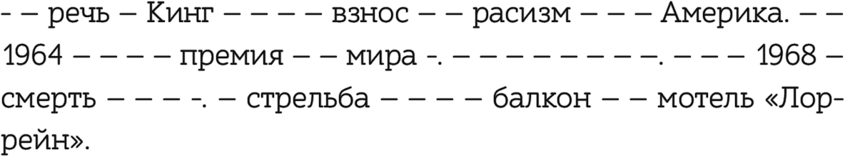 Из 58 слов оригинального текста вы увидели десять имен существительных, две даты, одно имя и одно название. Есть вероятность, что вы уже немного понимаете, о чем текст, вам не хватает лишь нескольких деталей. Имена существительные – лучшие показатели содержания текста, но вам нужны и другие слова, чтобы понять детали. Конспектируя текст, попробуйте сначала записать только имена существительные. Если вы все еще упускаете что-то важное, дополните конспект другими частями речи, в том числе глаголами, служебными словами, именами прилагательными{43}.