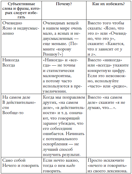 В большинстве случаев субъективный язык легко заметить: он категоричен и не основан на фактах. Есть, однако, ряд субъективных сигнальных слов, которые могут заставить слушателя отключиться или, что еще хуже, обернуться против нас, если мы недостаточно аккуратны в их употреблении. Приведу несколько из них (см. таблицу).
