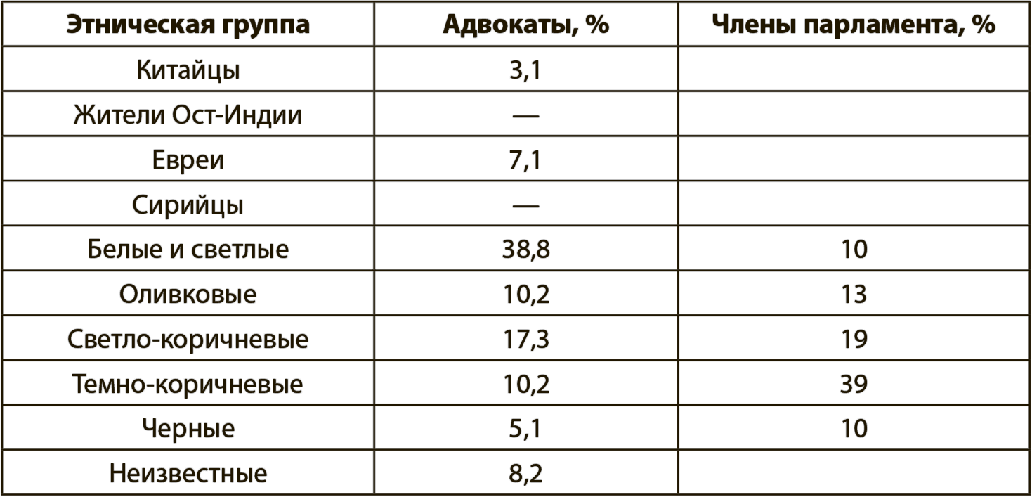 Ниже представлена разбивка по двум категориям ямайских профессионалов – адвокатов и членов парламента – на 1950?е гг. Разбивка производилась по оттенку кожи. «Белые и светлые» относится к людям либо совершенно белым, либо – что более вероятно – имеющим черные корни, уже не столь очевидные. «Оливковый» – на тон, а «светло-коричневый» – еще на тон темнее (хотя разница между этими двумя оттенками заметна, как правило, только ямайцам). При этом надо помнить о том, что в 1950?е гг. чернокожие составляли до 80 % всего населения Ямайки, соотносясь с цветным населением в пропорции пять к одному.