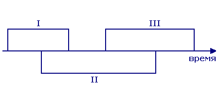 Каждый из интервалов I, II и III включает как период сходящегося, так и период расходящегося аспекта. На этом рисунке нет ни одного временного интервала, где бы перекрывались все три аспекта. Поэтому вероятность реализации события не велика.