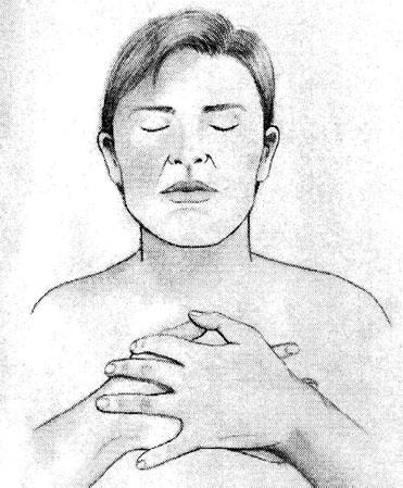 В этой позиции вы кладете ладонь одной руки (левой или правой) на ту область грудной клетки, где находится сердце, и накрываете ее другой ладонью.
