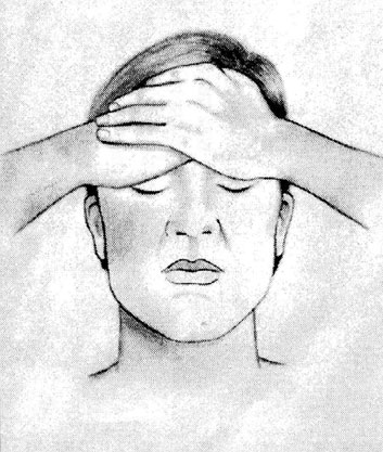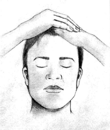 В этой позиции вы кладете ладонь одной руки (левой или правой) на лоб так, чтобы мизинец находился чуть ниже бровей (слегка касаясь верхней части переносицы), и накрываете ее другой ладонью. Опять же, вы можете предпочесть спокойную позицию, одну-три минуты удерживая руки в таком положении, или, для достижения более быстрых результатов, активную позицию, совершая руками круговые движения, массируя кожу и меняя направление движения каждые 15 секунд в течение того же времени. Имейте в ввиду: круговые движения совершаются не потому, что так более удобно, а потому, что, как показывает опыт, с их помощью достигаются более быстрые результаты.