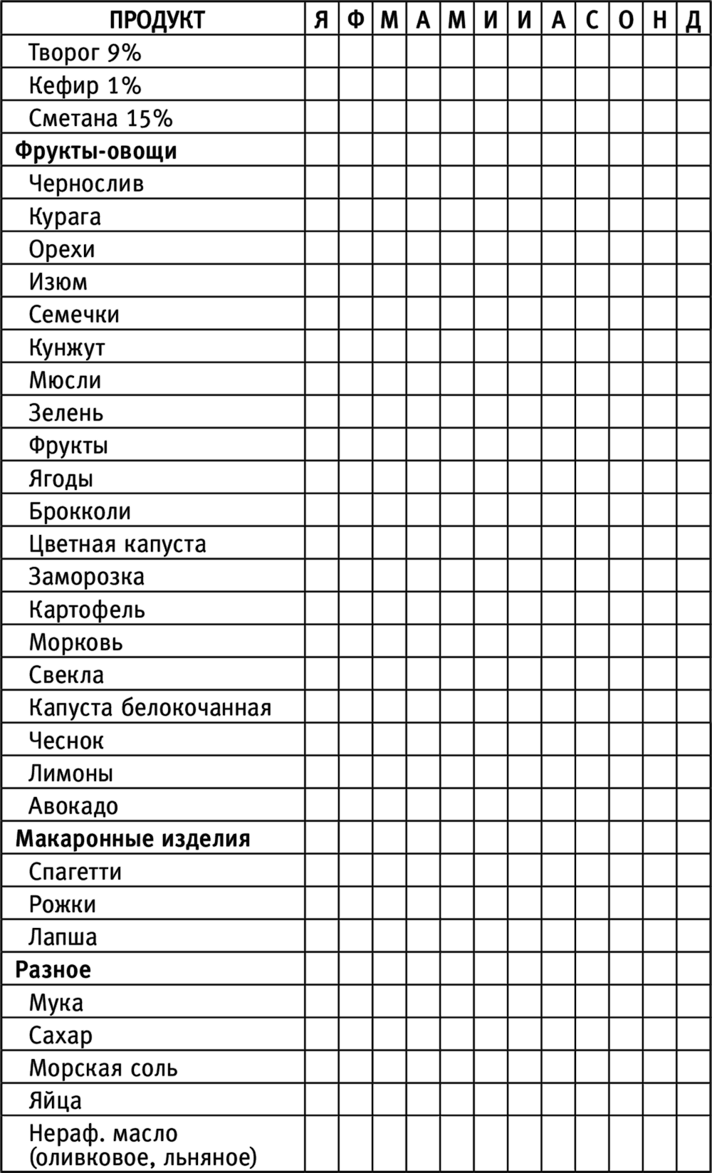 Для того чтобы поход в магазин за покупками еды не превращался в пытку, советую воспользоваться списком покупок, который я разработала для своей семьи. Он облегчает выбор продуктов, потому что строго ограничивает его, но в то же время, в нем есть все необходимое для того, чтобы вкусно питаться в течение месяца. Здесь все продукты распределены по тематическим группам, но в идеале лучше сгруппировать их по ходу движения в магазине, чтобы, опять же, поскорее вернуться домой.