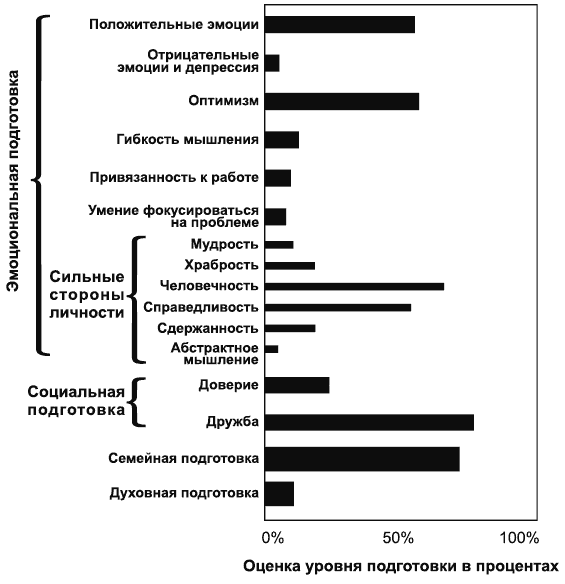 Армия предлагает военнослужащим пройти курсы университетского уровня по военной истории, экономике и так далее. Онлайн-курсы при каждом из четырех направлений подготовки, а также курс по посттравматическому восстановлению для всех военнослужащих стали второй составляющей Комплексной программы подготовки. Генерал Корнум пригласила для разработки каждого курса ведущих позитивных психологов: Барбара Фредриксон занималась эмоциональной подготовкой, Джон Касиоппо – социальной, Джон и Джули Готтман – семейной, Кен Паргамент и Пэт Суини – духовной, а Рик Тедески и Рич Макнелли – посттравматическим восстановлением. Когда солдат выполняет «тест общей оценки», он (или она) видит количество баллов, психологическую характеристику и рекомендацию, какие курсы стоит пройти.