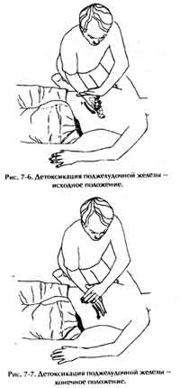a. Расположите ребро ладони по середине живота, так чтобы оно оказалось над головкой поджелудочной железы, и вдавите его поглубже. Прилагайте такое усилие, какое ученик в состоянии выдержать. Если это допустимо, добавьте вес второй руки, положив ее сверху. Если вы работаете с человеком, привыкшим употреблять много сахара, или с алкоголиком, эта область будет очень болезненной (рис. 7-6). Не забывайте основное правило: выполнять массаж медленно и мягко. Чем плотнее поджелудочная железа, тем мягче должен быть массаж.