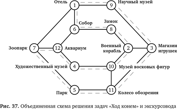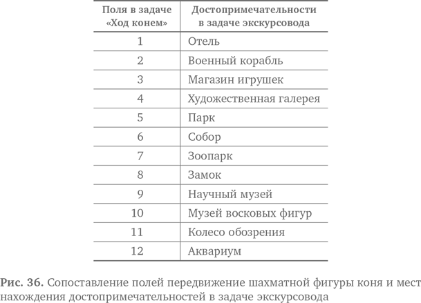 В обоих задачах вас просят найти гамильтонов цикл! Таким образом, мы использовали прием из вычислительного мышления. Мы обобщили обе задачи, чтобы они стали одинаковыми, и сделали это с помощью сопоставления с образцом, увидев важнейшие сходные черты. При этом мы абстрагировались от деталей, таких как отели и туристические достопримечательности или необходимость ходить конем или ехать по линиям метро.
