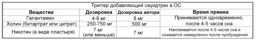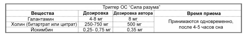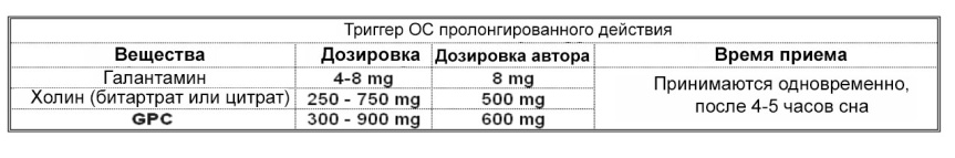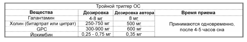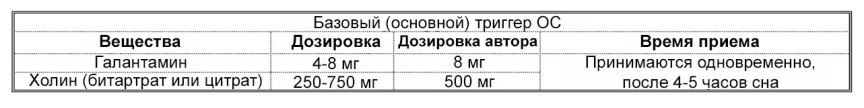 Во второй части книги, я определил четыре вещества, которые могут выступать в качестве триггеров ОС: Галантамин, GPC, Никотин и Йохимбин. Каждая из комбинаций, представленных в этой главе включает в себя основную комбинацию (Галантамин/Холин) плюс один или более дополнительный триггер с целью улучшения результата.