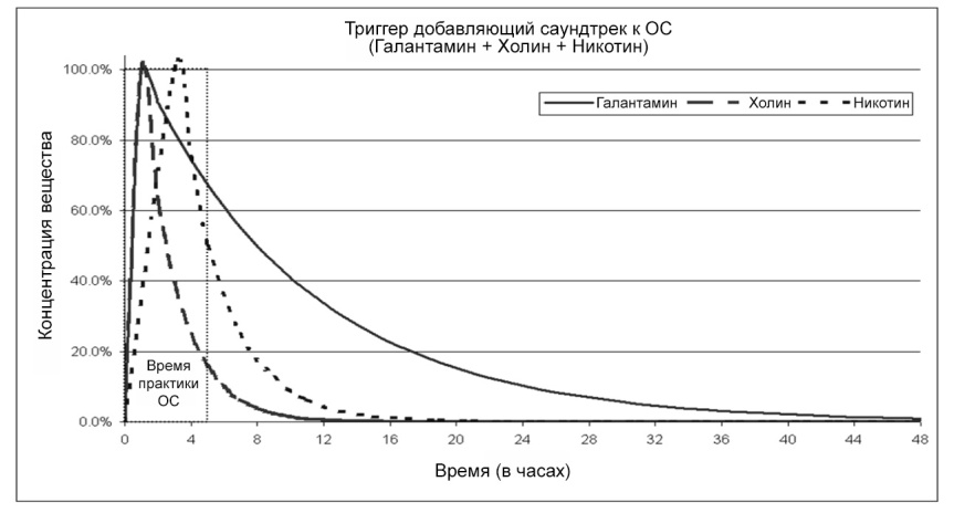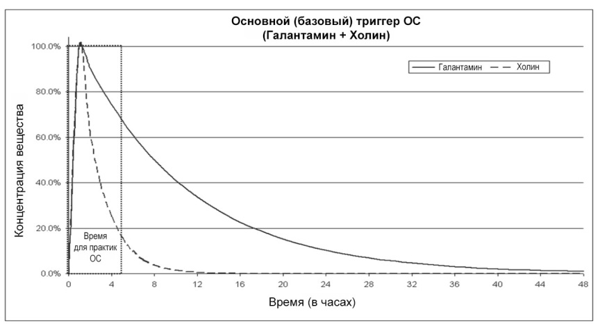 Кривая концентрации дает визуальное представление о том, как вещества взаимодействуют по времени, так же на ней четко видно идеальный временной промежуток для практик ОС. Кривая концентрации основного (базового) триггера ОС показывает, что Холин играет важную роль в течении первого часа, а затем его влияние быстро снижается. Он оказывает синергетическое влияние совместно с Галантамином, для быстрого увеличения уровня ацетилхолина в головном мозге, а повышенный уровень ацетилхолина, в свою очередь, существенно увеличивает ваши шансы на выход в ОС.