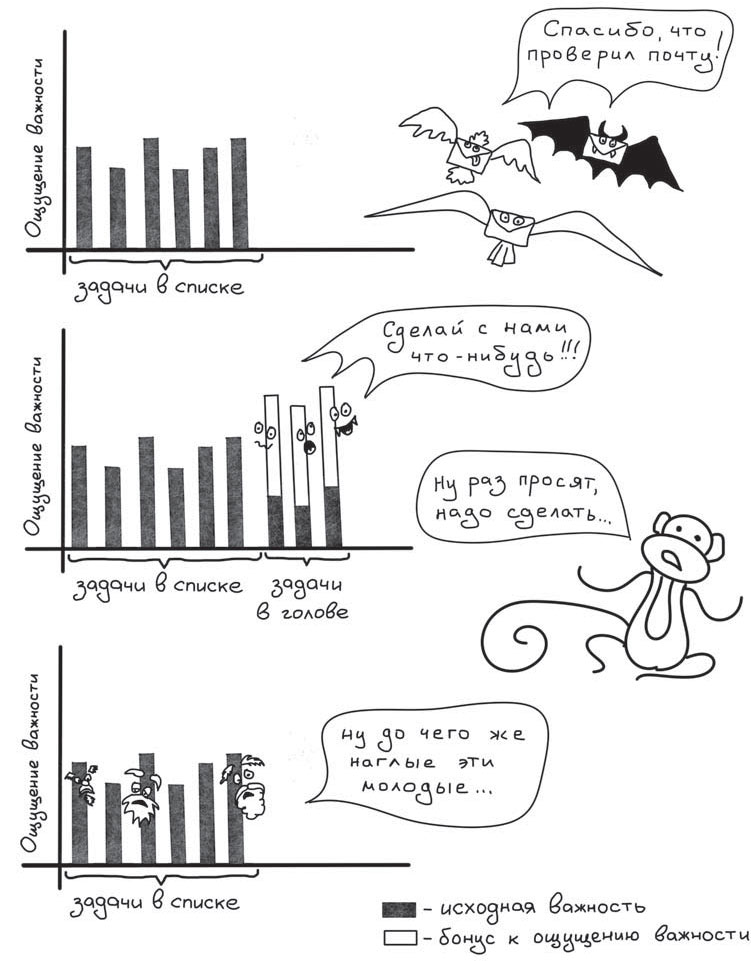 Если эти задачи сформулированы просто и легко для восприятия, они тут же проникнут в ваш ум, получат примерно такой же бонус к ощущению важности, и их сравнение по уровню важности или срочности с недавно прилетевшими задачами станет более справедливым.