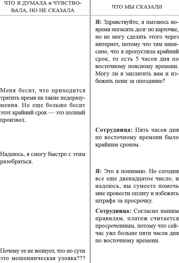 Я вошла в Сеть, чтобы погасить долг по кредитной карте, потому что это нужно было сделать именно в тот день. Когда я навела курсор на кнопку «оплатить», она стала прозрачной и не реагировала на клик. Мелким шрифтом рядом с ней было написано, что платежи должны производиться до 5 часов дня по восточному поясному времени в указанный день. В Калифорнии, где я живу, было 4 часа дня, соответственно, на Восточном побережье было 7 часов вечера. Я позвонила в службу технической поддержки потребителей, чтобы они провели операцию, и мне не пришлось бы платить пеню за просрочку. Я дозвонилась до сотрудницы, занимающейся кредитными картами.