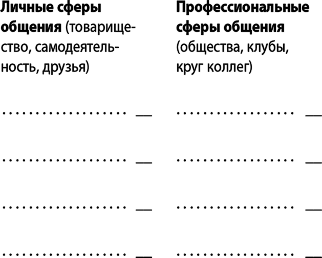 Круг общения – это одна большая область, включающая все наши контакты. Мы все связаны отношениями, как личными, так и профессиональными. Мы знаем людей, люди знают нас. Мы встречаемся в семье, в кругу друзей, в спортивных клубах, в кафе, на работе, в ротари-клубах, на приемах и конференциях. Возможность расширить круг общения есть повсюду, где мы не одни: на семейном празднике, на вечеринке, на соревнованиях по плаванию или в очереди в кассу в супермаркете. Короче говоря, все виды общения связаны с установлением или поддержанием контактов.