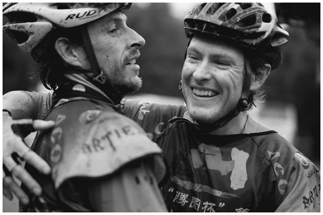 В сложных обстоятельствах рождается крепкая дружба. Мы с Джоном (слева) стали близкими друзьями за годы совместных соревнований по всему миру. Он не стал ко мне хуже относиться даже после того, как я провертел ему дырку в ногте в забытом богом месте посреди пустыни! На этом снимке мы поздравляем друг друга с финишем в Китае. Фото: Китайская ассоциация альпинизма