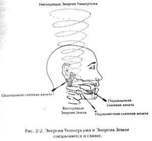 Учение Дао утверждает, что Небесные и Земные Силы, смешиваясь, производят слюну (рис. 2-2). Слюна - основа энергетической силы, подобно энергии мужского семени или женской яйцеклетки. Кроме того, даосы считают, что слюна составляет основную часть пищи. Если вы пережевываете пищу до тех пор, когда рот заполнится слюной, вага желудок получит одну часть пищи и две части слюны. Это лучшая смесь для пищеварения. Далее, важно следить за тем, чтобы не пить слишком много жидкости во время еды, поскольку жидкость разбавляет слюну и желудочный сок, изменяя их естественный состав, соответствующий качеству принятой пищи. Пища, содержащая слишком много специй или слишком соленая, часто провоцирует, неумеренное потребление жидкости.