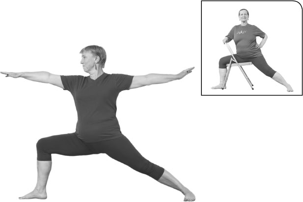 • Если вам трудно согнуть ногу и удерживать равновесие в пространстве, сделайте Вирабхадрасану 2 «сидя». Просуньте правую ногу за сиденье стула без спинки, согните ногу и сядьте на стул, придерживаясь за него руками. Посидите около минуты и выполните позу в другую сторону. Чтобы вам было легче делать позу, положите на сиденье стула несколько одеял или валик – тогда вам не нужно будет сгибать ногу слишком сильно.