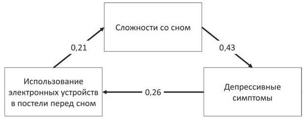 В ходе одного из исследований{43} изучали связь между использованием смартфона в постели, симптомами депрессии и расстройствами сна и пришли примерно к такой модели явления: