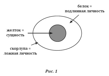 Чтобы наглядно представить человеческое существо, в духовной психологии используется образ яйца. Есть скорлупа, представляющая ложную личность, которую нужно расколоть. Желток представляет сущность, а белок подлинную личность. Сущность будет расти, используя подлинную личность и все ее достоинства, чтобы расколоть ложную. Пока остается скорлупа, цыпленок не может родиться. Но если внутри дух будет обеспечен питанием через работу над собой, желток не останется желтком, он испытает процесс роста, станет живым существом, которое однажды прорвется сквозь скорлупу.