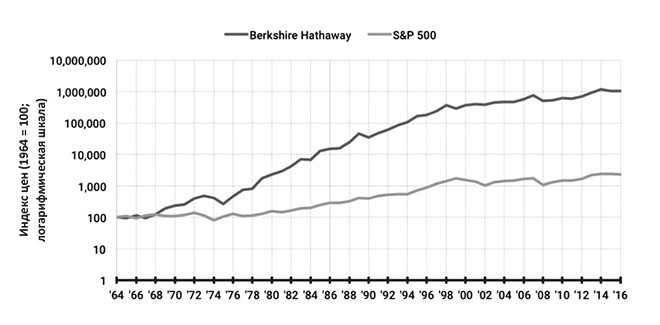 Если мы принимаем финансовые решения с учетом отдаленной перспективы, наблюдать за тикером бессмысленно. Посмотрим диаграмму котировок акций Berkshire Hathaway с 1964 года.