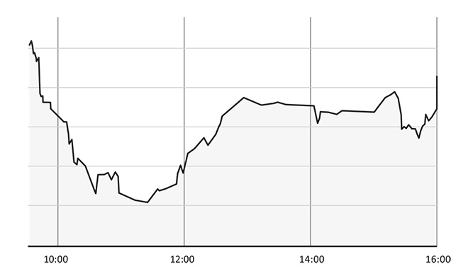 А теперь взгляните на колебания котировок в случайно выбранный день (где-то в конце января 2017 года). Падение цены до минимальных значений кажется пугающим. Представьте, что почувствовал наблюдатель — владелец акций около 11:30.