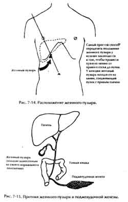 Функция желчного пузыря состоит в хранении и концентрации желчи до тех пор, пока она не потребуется тонкой кишке для процесса пищеварения. Желчь необходима для расщепления содержащихся в пище жиров (рис. 7-15). Основной проблемой, связанной с желчным пузырем, является возможность его чрезмерной закупорки желчными солями. Кроме того, туда могут попасть бактерии, и желчь, обволакивая их, образует камни, похожие на жемчужины. Часто таких "жемчужин" образуется очень много, и они перекрывают желчевыводящий проток, что приводит к необходимости хирургического удаления желчного пузыря.