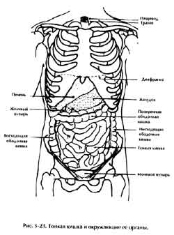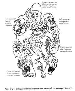Тонкая кишка несет ответственность не только за переваривание пищи, но и за "переваривание" эмоций. Различные сжатия тонкой кишки соответствуют непереработанным эмоциям. Поэтому в традиционной китайской медицине тонкую кишку называют брюшным мозгом. Все негативные эмоции отражаются на тонкой кишке в виде пережатий и изгибов. Гнев сжимает правую сторону кишки, рядом с печенью. Волнение оказывает влияние на ее верхнюю левую часть, которая находится рядом с селезенкой. Нетерпение и беспокойство действуют на середину верхней части тонкой кишки. Грусть атакует обе стороны нижней части. Страх поражает более глубокие нижние участки брюшной полости (рис. 5-24).