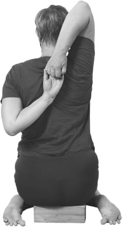 Вытяните правую руку вверх, разверните ее наружу в плечевом суставе, согните руку в локте и поместите тыльную поверхность правой ладони на спину между лопатками, разворачивая пальцы рук к потолку. Отведите правое плечо назад, чтобы грудная клетка не закрывалась. Поднимите вверх левую руку, согните ее в локте. Дотянитесь пальцами левой руки до пальцев правой, сцепите пальцы рук за спиной. Тяните левый локоть к потолку, а правый – к полу. Дышите спокойно. Останьтесь в позе 20–30 секунд. Медленно освободите руки, сделайте несколько дыханий в Вирасане. Поменяйте положение рук и выполните позу еще раз.