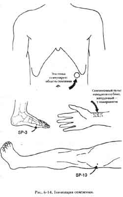 1) Одну руку держите на канале селезенки в точке SP-10, которая находится на бедре возле колена (рис. 6-14). Другой рукой массируйте область желудка и селезенки (вдоль нижнего края грудной клетки) (рис. 6-13). При этом ученик может проявлять некоторое беспокойство.